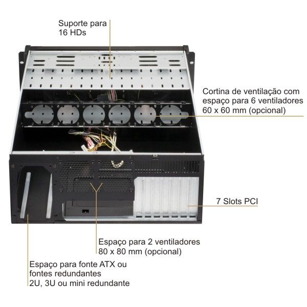 Esse chassis de rack aloja até 16 HDs, sendo indicado para acomodar os discos rígidos